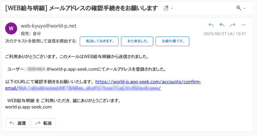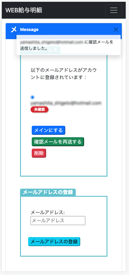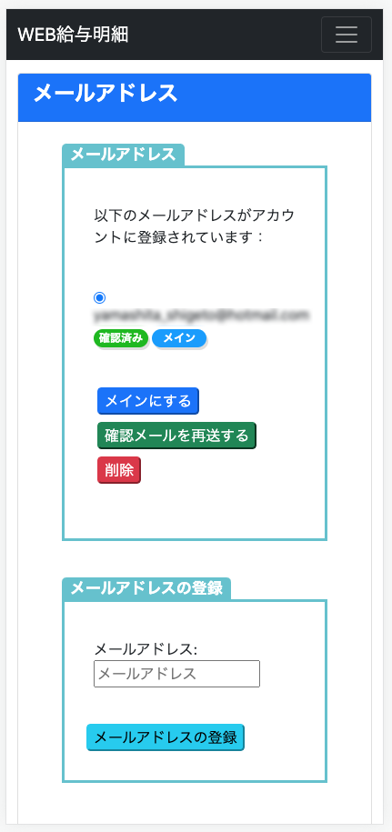 メールアドレスの登録 ヘッダ のユーザー名をクリックして、メニューを表示 「メール変更」へ進みます メールが登録されていない初期画面 メールアドレスを入力し、「メールアドレスの登録」をクリック ↓ ↓ 登録したメールアドレスに下記のメールが届きます。 届いたメールに記載されたURLをクリックすると以下の確認画面が開きます ↓ 「確認する」ボタンを押してください ↓ メールアドレス登録完了です。 メールアドレス変更画面で、「確認済み」マークが表示されている事をご確認ください。 メールはいくつでも登録できますが、「メイン」のアドレスを選択する必要があります。